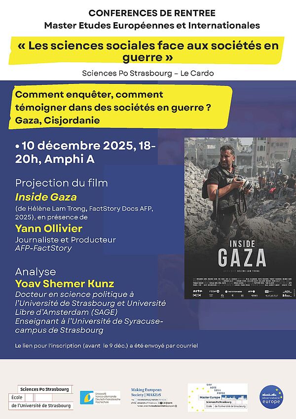 La conférence du Master EEI du 10 décembre est néanmoins maintenue, sur le thème : Comment enquêter, comment témoigner dans des sociétés en guerre ? Gaza, Cisjordanie