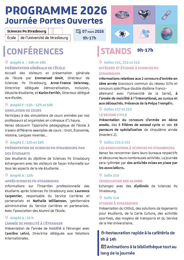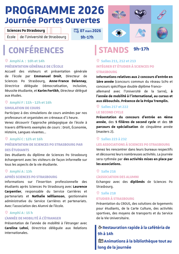 Des étudiants du diplôme de Sciences Po Strasbourg échangeront avec les visiteurs de façon informelle sur tous les aspects de la vie étudiante.