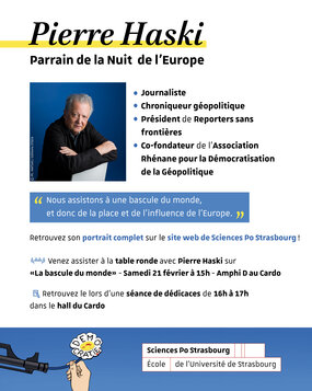 - 16h / 17h : Table ronde avec Ania NUSSBAUM, diplômée de Sciences Po Strasbourg, journaliste, correspondante pour Bloomberg, spécialisée dans la politique économique, la vie politique française et les relations internationales, autour de son livre "Accréditée, sept ans au Palais de Macron" - Animée par Adèle THOUMYRE et Lillian VYPLASYL, étudiants à Sciences Po Strasbourg - Amphi E
