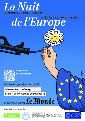 Animée par Patrick DOLLAT (maître de conférences en droit européen, Sciences Po Strasbourg). Avec Guillaume DELMOTTE (Ville et eurométropole de Strasbourg) et Maëlle AILLET (vice-présidente des Jeunes européens à Strasbourg). Dessin de presse en direct (Yannick LEFRANCOIS - Piet - Laurent SALLES) - Amphi D