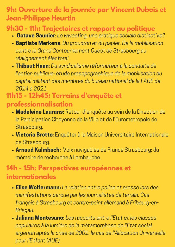Journée organisée par la promotion 2021-2022 du master. Parmi les thèmes abordés : "Trajectoires et rapport au politique" - "Terrains d'enquête et professionnalisation" et "Perspectives européennes et internationales". Journée ouverte à tous.