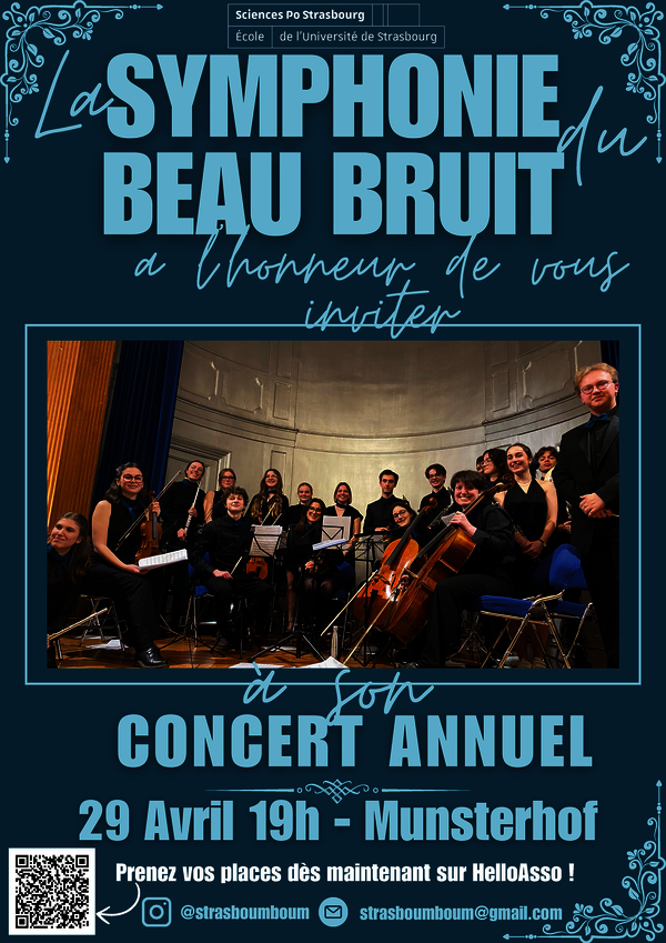 Stras'Boum Boum - association de Sciences Po Strasbourg - a l'honneur de vous inviter au concert de fin d'année de sa nouvelle branche, la Symphonie du Beau Bruit, le mardi 29 avril à 19h dans la magnifique salle du Munsterhof à Strasbourg.
