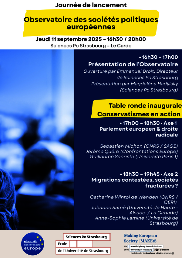 Le Master Études européennes et internationales de Sciences Po Strasbourg en collaboration avec le think tank « Confrontations Europe » et soutenu par l’ITI MAKErS Fabrique de la société européenne est heureux de vous convier au lancement officiel de l'Observatoire des sociétés politiques…