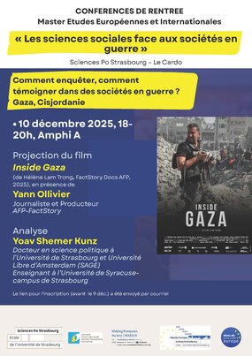 La rencontre avec les deux conférenciers sera précédée de la projection du film Inside Gaza (2025), réalisé par Hélène Lam Trong à partir des images et vidéos personnelles tournées par des journalistes gazaouis.