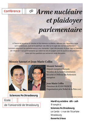 Telles sont les questions qui animeront cette discussion autour de M. Mounir Satouri, député européen français, membre de la Sous-commission Sécurité et Défense du Parlement européen et de M. Jean-Marie Collin, Directeur de  ICAN France (organisation prix Nobel de la Paix 2017) et intervenant au sein de l’IEP Strasbourg.