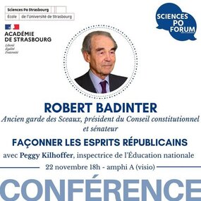"Façonner les esprits républicains" : Sciences Po Forum vous donne rendez-vous le 22 novembre à 18h en Amphi A (visio) pour une conférence avec Robert Badinter, ancien garde des Sceaux, président du Conseil constitutionnel et sénateur.