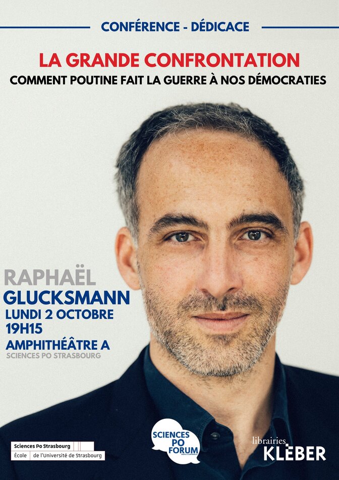 [Conférence Sciences Po Forum] Le 2 octobre 2023 à 19h15 en Amphithéâtre A de Sciences Po Strasbourg, retrouvez Raphaël Glucksmann pour une conférence sur son nouvel ouvrage "La grande confrontation : comment Poutine fait la guerre à nos démocraties".