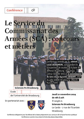 Dans le cadre du partenariat GSBDD/SCA/Sciences Po Strasbourg, une conférence sur le thème "Le service du commissariat des armées : concours et métiers" aura lieu le 21 novembre de 18h à 20h.