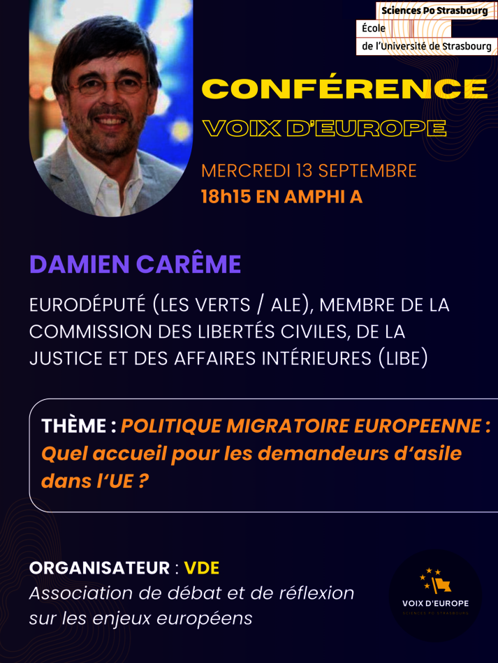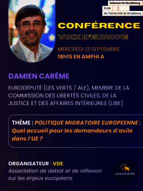 L'association Voix d'Europe vous propose le mercredi 13 septembre une conférence sur le thème "Politique migratoire européenne : Quel accueil pour les demandeurs d'asile dans l'UE ?" en présence de Damien Carême, eurodéputé (Les verts, ALE), membre de la commission des libertés civiles, de la justice et des affaires intérieures (LIBE).
