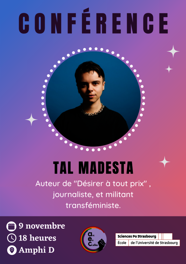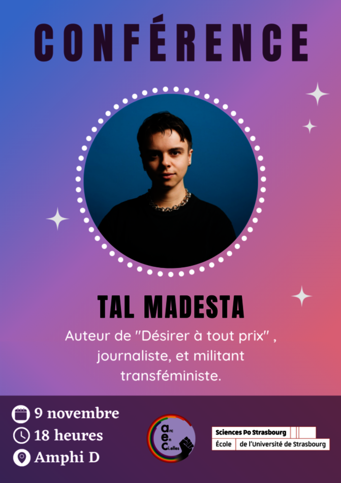 L'association Arc en ci'elles vous donne rendez-vous le mercredi 9 novembre pour une conférence avec Tal Madesta, auteur de "Désirer à tout prix", journaliste et militant transféministe.