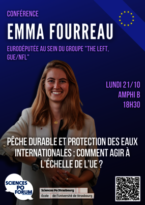 Diplômée de Sciences Po et experte en politiques environnementales, Emma Fourreau est membre du parti la France insoumise et du groupe GUE/NGL au Parlement européen. Elle interviendra sur le thème : "Pêche durable et protection des eaux internationales : comment agir à l'échelle de l'UE ?". Conférence ouverte à tous, sur inscription.