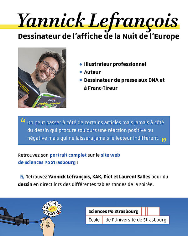 Animée par Patrick DOLLAT (maître de conférences en droit européen, Sciences Po Strasbourg). Avec Guillaume DELMOTTE (Ville et eurométropole de Strasbourg) et Maëlle AILLET (vice-présidente des Jeunes européens à Strasbourg). Dessin de presse en direct (Yannick LEFRANCOIS - Piet - Laurent SALLES) - Amphi D