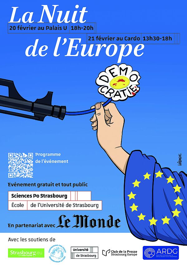 Animée par Patrick DOLLAT (maître de conférences en droit européen, Sciences Po Strasbourg). Avec Guillaume DELMOTTE (Ville et eurométropole de Strasbourg) et Maëlle AILLET (vice-présidente des Jeunes européens à Strasbourg). Dessin de presse en direct - Amphi D