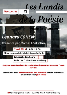 - 7 avril 2025 : Rencontre autour de l'oeuvre de Leonard Cohen.
