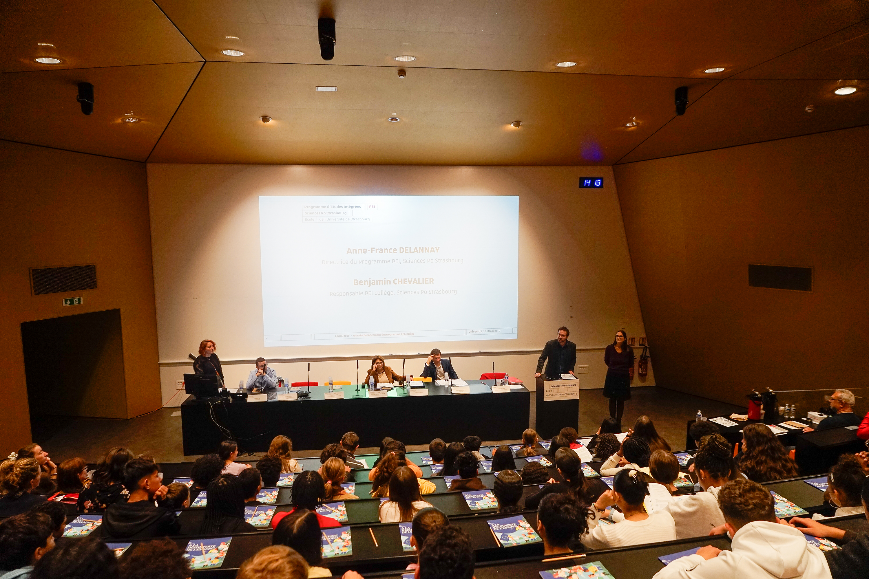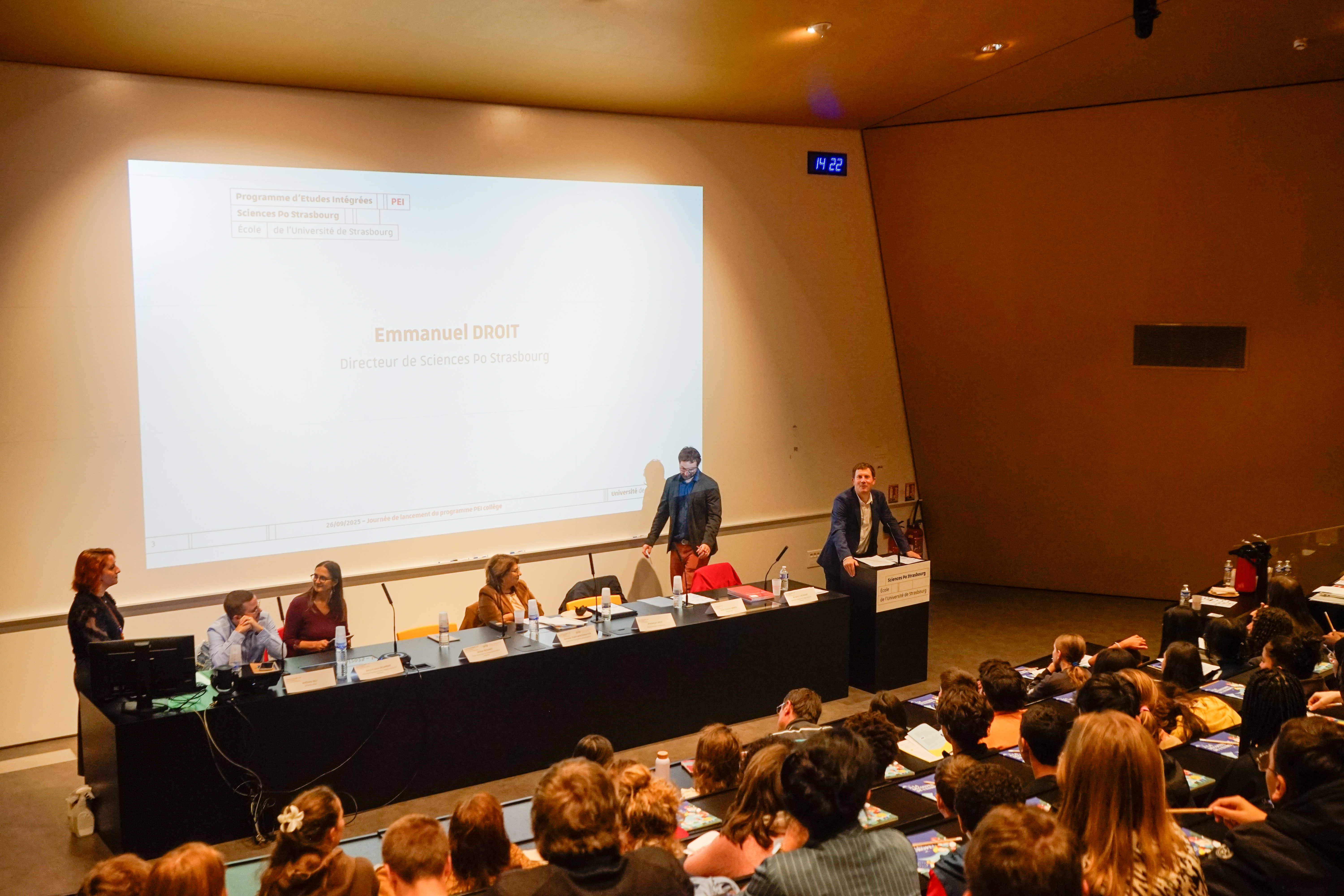 Au programme de cette journée, quelques mots d'accueil  d'Emmanuel Droit, directeur de Sciences Po Strasbourg, d'Anne-France Delannay, directrice du programme PEI et de Benjamin Chevalier, responsable pédagogique du programme PEI Collège.