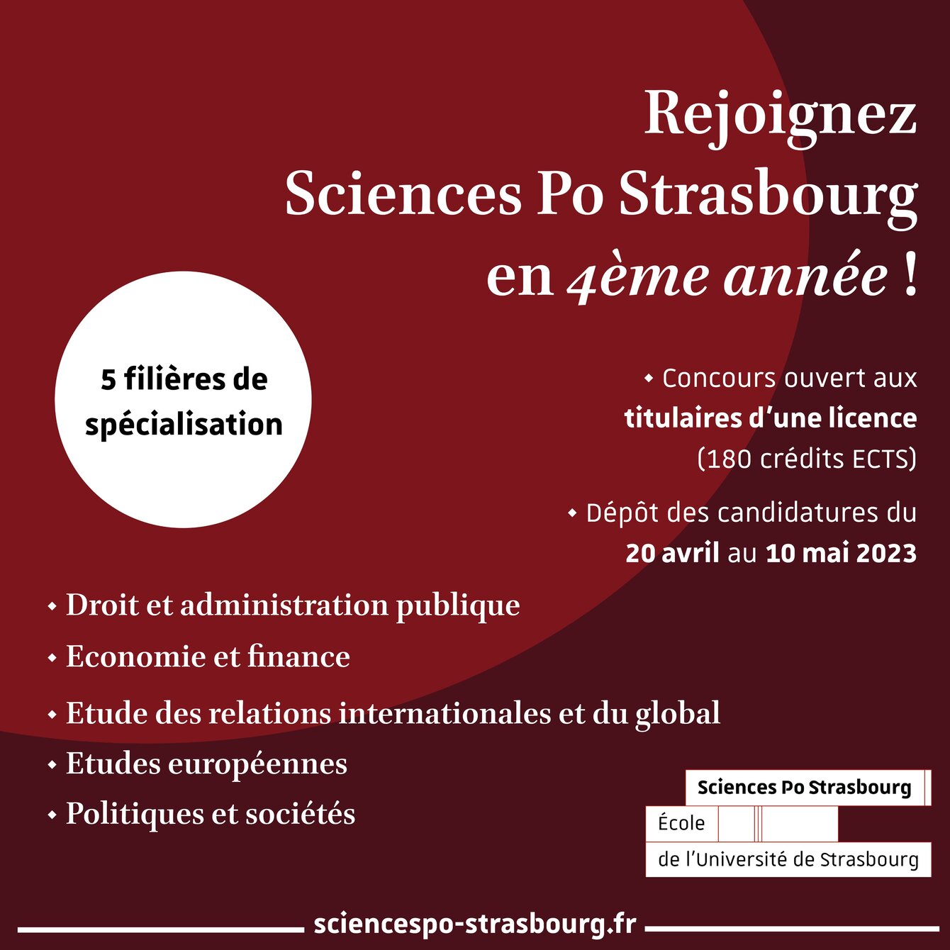 Sciences Po Strasbourg vous offre la possibilité d’intégrer son cursus directement en quatrième année avec une licence (ou une équivalence de 180 ECTS). 70 places sont ouvertes pour le concours 2023.