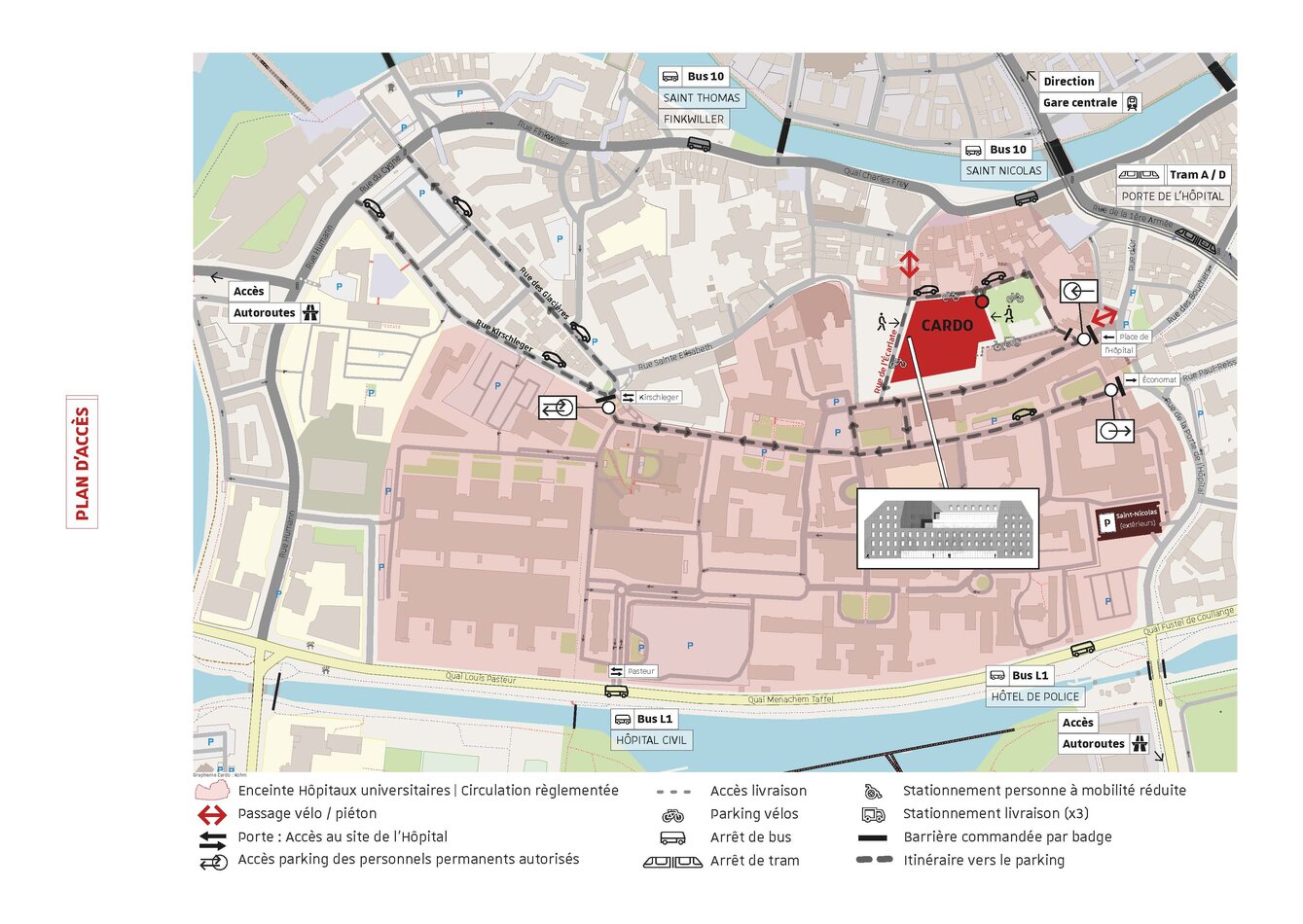- Avec le Tram : Prendre le Tram A depuis l'arrêt Gare Centrale en direction d'Illkirch Graffenstaden - Descendre à l'arrêt Porte de l'Hôpital.